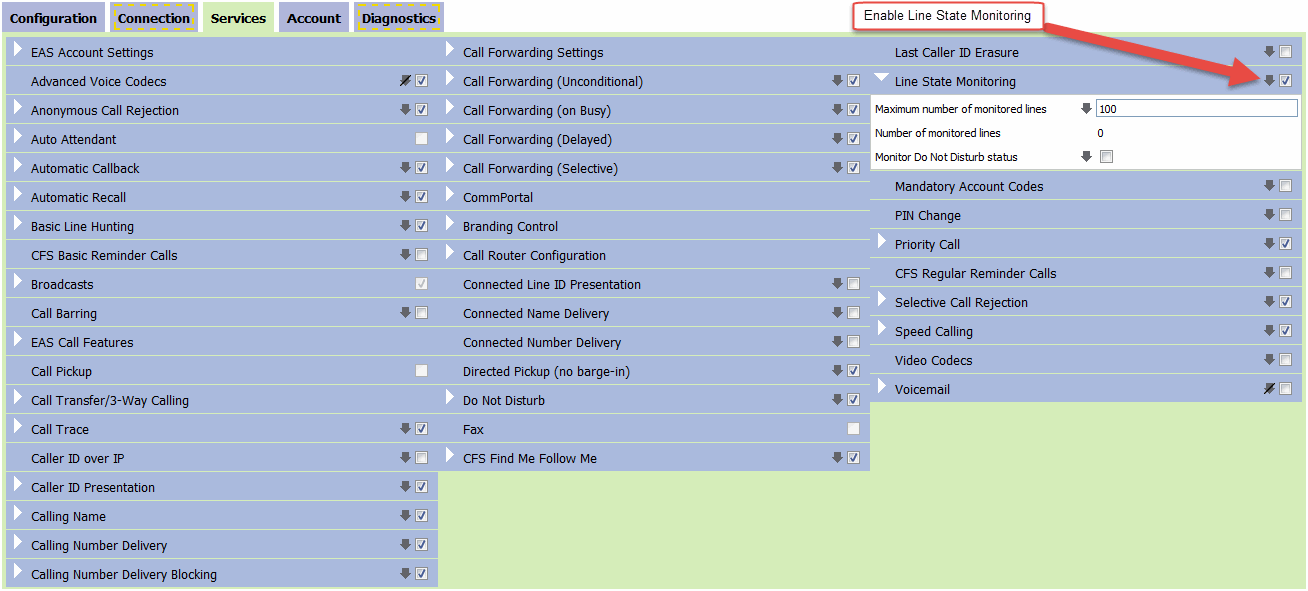 You also need to ensure that the VOP line has "Line State Monitoring" enabled. This option is under "Services" in Metaview Web. You can see a screenshot of this option by